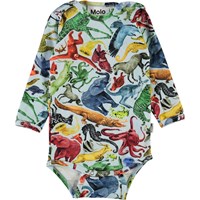 Field ist ein hellblauer langärmliger Baby-Body mit Druck von verschiedenen bunten Tieren. Druckknöpfe am Hals und zwischen den Beinen machen das an- und ausziehen einfach. Ecocert Greenlife, certifikationsnr. 197496