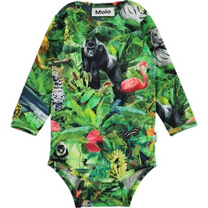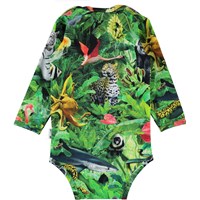 Field ist ein langärmliger Baby-Body mit 'Fantasy Jungle' Druck, mit vielen verschiedenen Tieren im Dschungel, die sich in der Regel dort nicht befinden. Druckknöpfe am Hals und zwischen den Beinen machen das an- und ausziehen einfach. Ecocert Greenlife, certifikationsnr. 197496