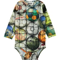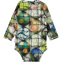 Field ist ein langärmliger Baby-Body mit Druck von bunten Fußbällen hinter einem Netz. Der Body hat Druckknöpfe am Hals und zwischen den Beinen, die es leicht machen, den Body ab and an zunehmen. Ecocert Greenlife, certifikationsnr. 197496