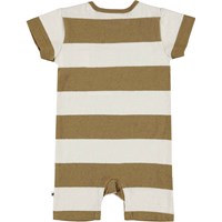 Finn ist ein gestreifter Babyanzug in den Farben Grün-Braun und Weiß. Der Anzug hat kurze Ärmel und Beine. Druckknöpfe am Hals und zwischen den Beinen erleichtern das An- und Ausziehen.