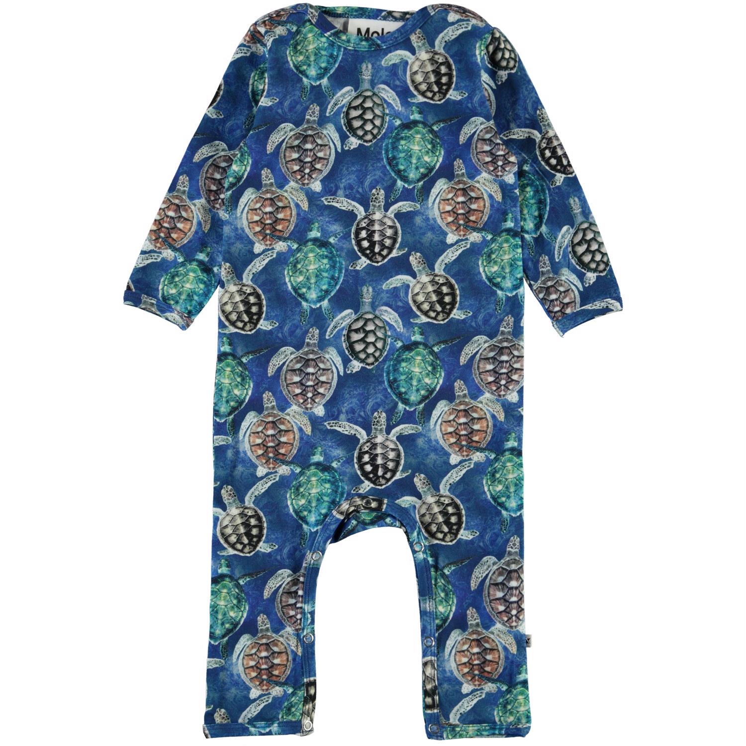 Fleming ist ein Baby-Anzug mit langen Ärmeln und Beinen. Der Anzug ist in Blau und mit Schildkröten-Druck. Druckknöpfe am Hals und zwischen den Beinen machen das an- und ausziehen einfach. Ecocert Greenlife, certifikationsnr. 197496