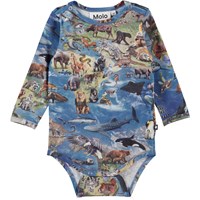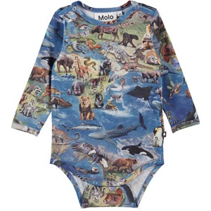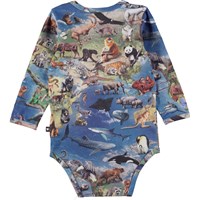 Foss ist ein blauer Baby-Body mit langen Ärmeln aus 100 % Öko-Baumwolljersey. Foss hat Druckknöpfe im Kragen und zwischen den Beinen, die das An- und Ausziehen des Bodys erleichtern. Der Body hat einen Allover-Print, Animal Earth, der die Kontinente unseres Planeten und alle Tiere zeigt, die sowohl im Wasser als auch an Land leben.