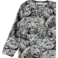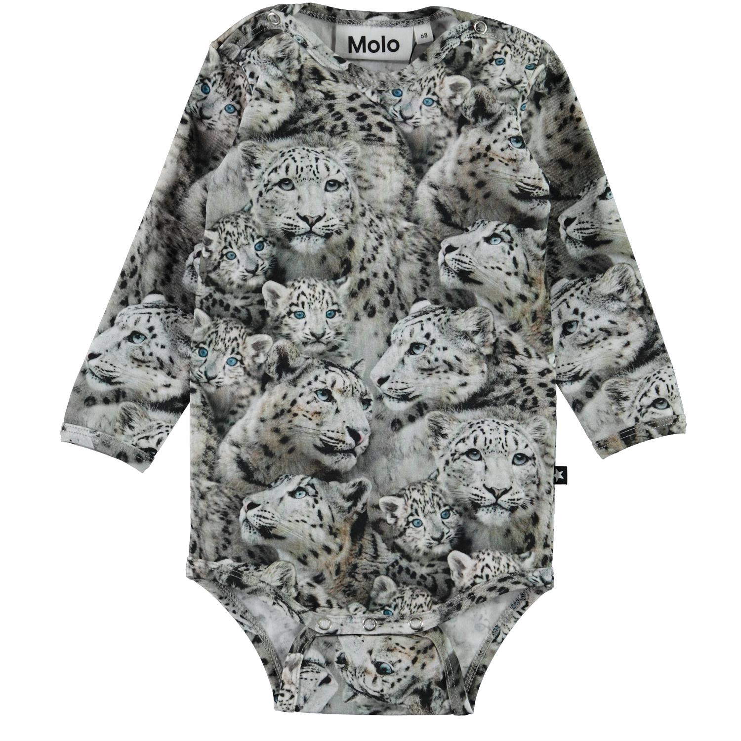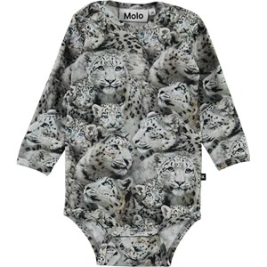 Foss ist ein langärmeliger Babybody in Grau mit Druck von Schneeleoparden. Druckknöpfe am Hals und zwischen den Beinen erleichtern das An- und Ausziehen.