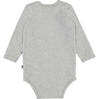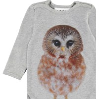 Foss ist ein langärmeliger Babybody in Grau mit einem Eulendruck auf der Vorderseite. Druckknöpfe am Hals und zwischen den Beinen erleichtern das An- und Ausziehen.