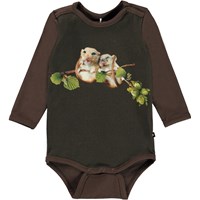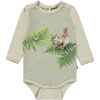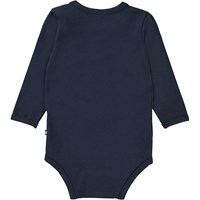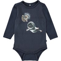 Foss ist ein dunkelblauer Babybody mit Aufdrucken von ein paar kleinen Tieren, die im Weltraum spazieren gehen. Foss hat einen Druckknopf im Kragen und zwischen den Beinen, der das An- und Ausziehen des Bodys erleichtert.