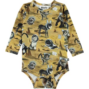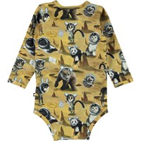 Foss ist ein gelber Babybody mit Aufdrucken verschiedener Tiere, die im Weltraum spazieren gehen. Foss hat einen Druckknopf im Kragen und zwischen den Beinen, der das An- und Ausziehen des Bodys erleichtert.