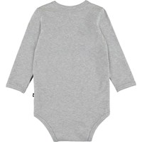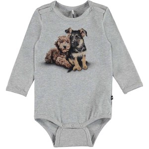 Foss ist ein grauer Babybody mit Welpendruck. Foss hat einen Druckknopf im Kragen und zwischen den Beinen, der das An- und Ausziehen des Bodys erleichtert.