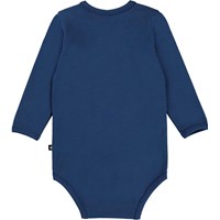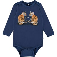 Foss ist ein blauer Babybody mit Aufdrucken von Tigerbabys, deren Schwänze ein Herz bilden. Foss hat einen Druckknopf im Kragen und zwischen den Beinen, der das An- und Ausziehen des Bodys erleichtert.
