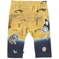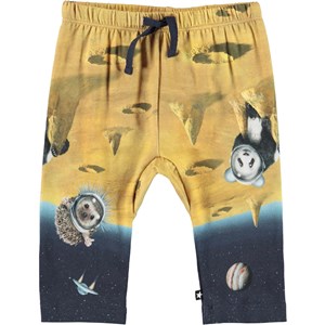 Sabb ist eine geräumige Babyhose mit Aufdrucken verschiedener Tiere, die auf dem Mond spazieren gegangen sind. Die Hose hat Bänder in der Taille.