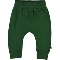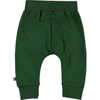 Sammy sind ein Paar große, grüne Babyhosen i Sweat-Look mit breiten, elastischen Ripp in der Taille und am Beinende.  Ecocert Greenlife, certifikationsnr. 197496