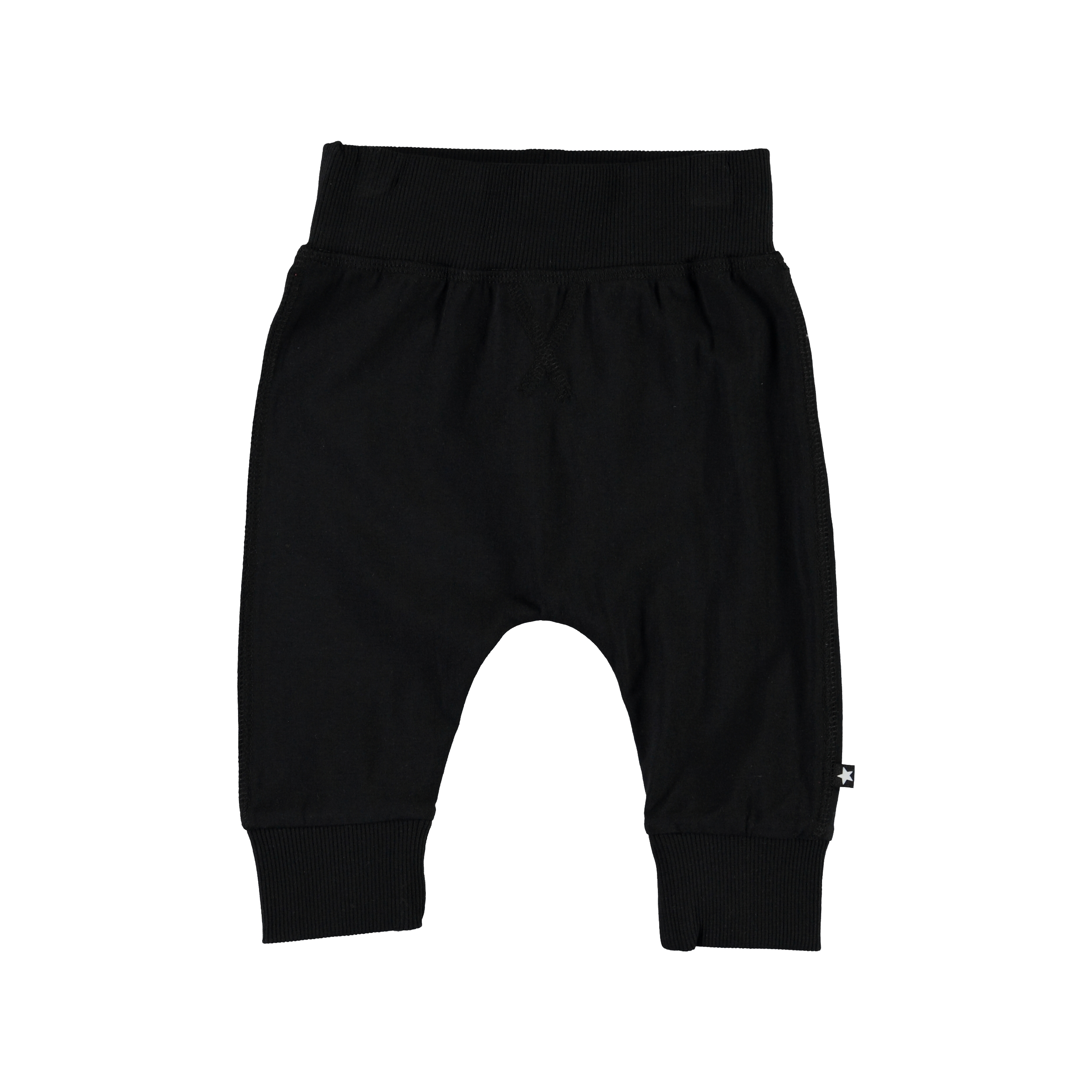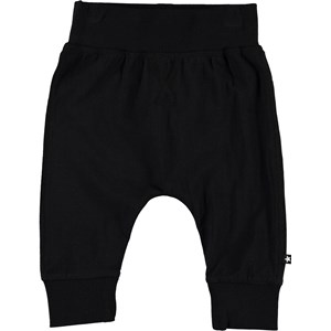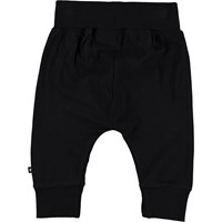 Sammy ist eine schwarze Babyhose. Die Hose hat eine breiten elastischen Ripp an der Taille und am Beinende, sowie sichtbare Stickereien an der Vorderseite, die der Hose einen Jogginghosen-Look verleihen.
