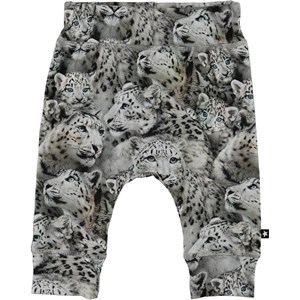 Sammy ist eine graue Babyhose mit Druck von Schneeleoparden. Die Hose hat breiten elastischen Ripp an der Taille und am Beinende sowie sichtbare Nähte an der Vorderseite, die der Hose einen Jogginghosen-Look verleihen.