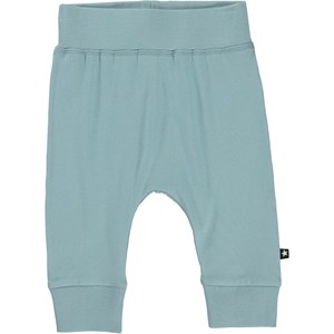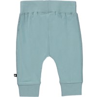 Hellblaue Babyhose mit weiter Passform. Die Hose hat einen breiten elastischen Rippsaum an der Taille und Beinabschluss sowie sichtbare Nähte vorne, die der Hose einen Jogginghosen-Look verleihen.