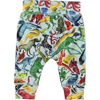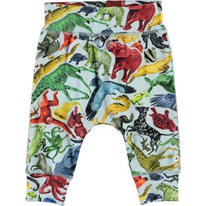 Sammy sind ein Paar räumige, hellblaue Babyhosen mit Druck von verschiedenen bunten Tieren. Die Hosen sind in Sweat-Look mit breiten, elastischen Ripp in der Taille und am Beinende. Ecocert Greenlife, certifikationsnr. 197496
