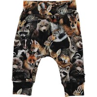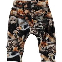 Sammy ist eine braune Babyhose mit Druck der Waldtiere. Die Hose hat breiten elastischen Ripp an der Taille und am Beinende sowie sichtbare Nähte an der Vorderseite, die der Hose einen Jogginghosen-Look verleihen.