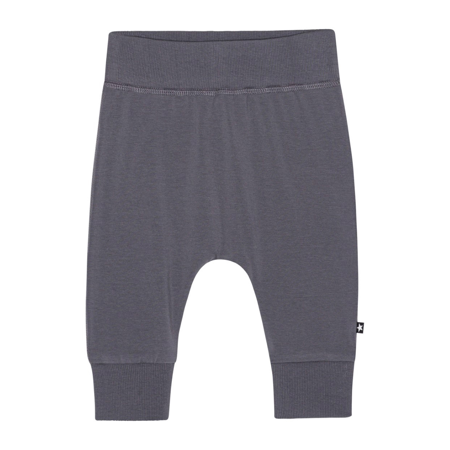 Graue Babyhose für die Kleinsten aus Öko-Baumwolljersey. Die Hose hat breiten elastischen Ripp an der Taille und am Beinende sowie sichtbare Nähte vorne, die der Hose einen Jogginghosen-Look verleihen. Die Hose ist weich zu tragen und bietet viel Bewegungsfreiheit.