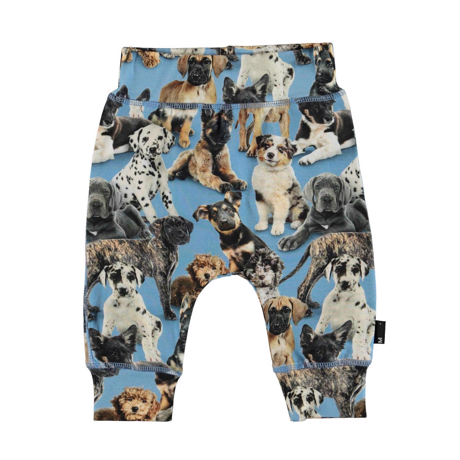 Sammy ist eine hellblaue Babyhose mit einem süßen Aufdruck von verschiedenen niedlichen Welpen. Kombinieren Sie mit passendem Oberteil. Die Hose hat einen breiten Gummizug an Taille und Beinabschluss, sowie sichtbare Steppnähte vorn, die der Hose eine Jogginghosen-Optik verleihen.