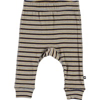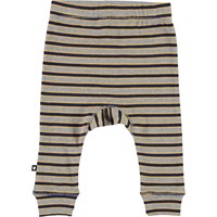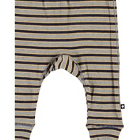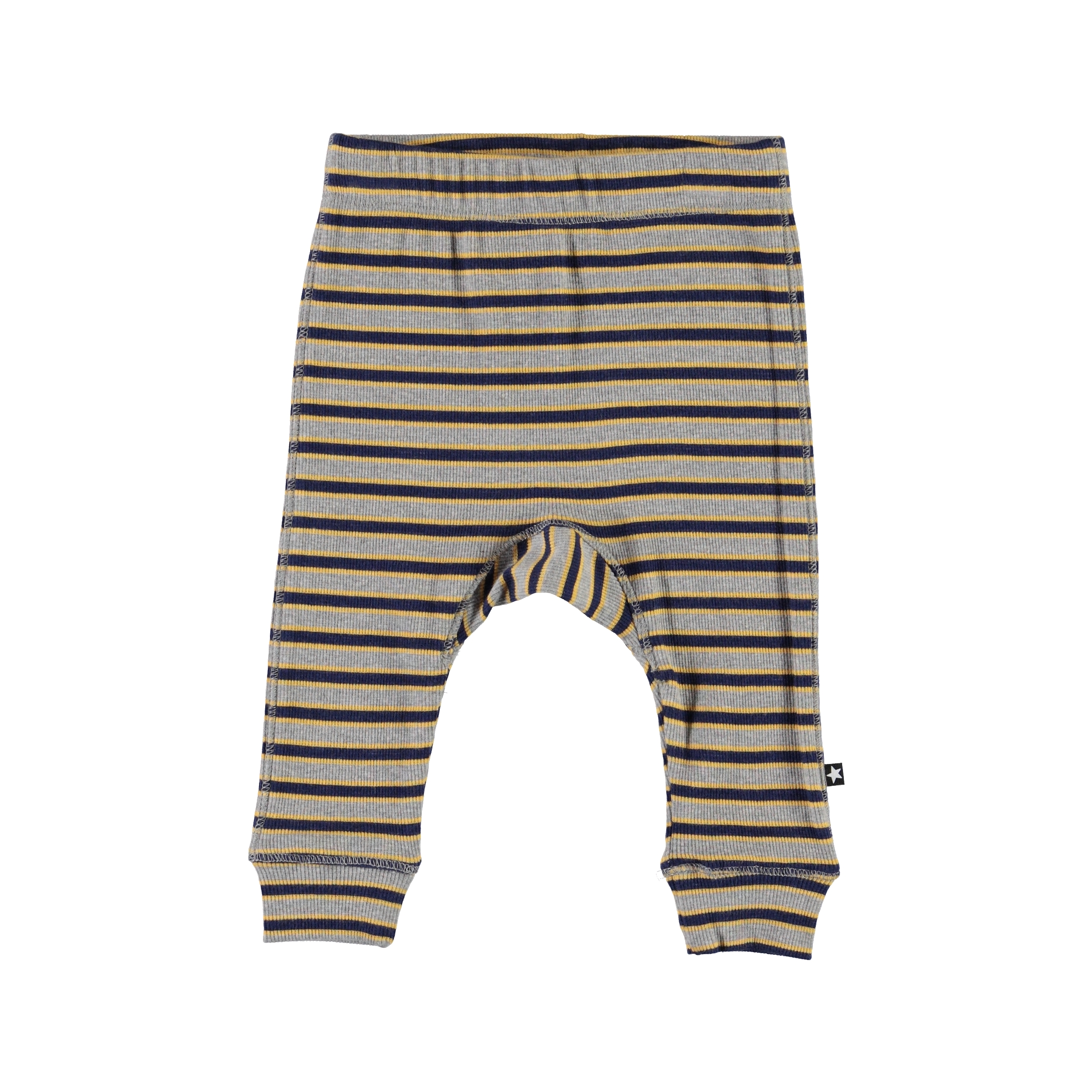 Seb ist eine gestreifte Babyhose in Grau, Blau und Gelb. Seb hat schmale Beine und Rippkante. Die Hose hat eine elastische Taille, die für eine bequeme Passform sorgt.
