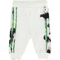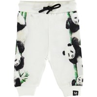Sol ist eine weiße Jogginghose mit einem Pandabären Print an den Seiten. Die Hose hat eine breite elastische Taille mit schwarzem Kordelzug.