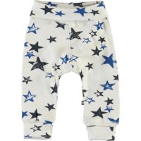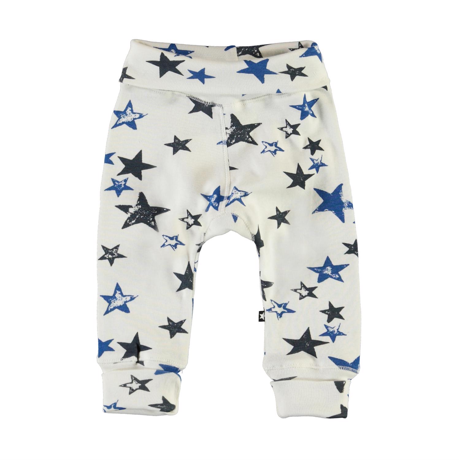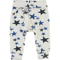 Son sind ein Paar weiße Babyhosen mit Druck von schwarzen und blauen Sternen. Die Hose hat Umschlag an der Taille und an den Beinen. Ecocert Greenlife, certifikationsnr. 197496