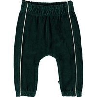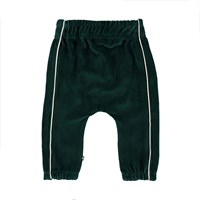 Storm ist eine dunkelgrüne Jogginghose aus Velour für Babys. Die Hose hat vorne eine weiße Paspelierung und eine elastische Taille.