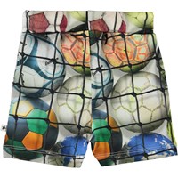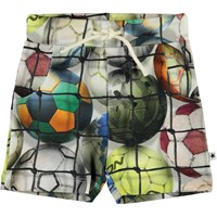 Simroy sind ein Paar Baby-Shorts mit Druck von bunten Fußbällen hinter einem Netz. Die Shorts haben eine elastische Taille mit Bindeband, die Komfort und eine gute Passform sichert. Ecocert Greenlife, certifikationsnr. 197496