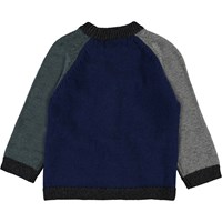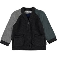 Benjamin ist eine Baby-Strickjacke in Color-block mit dunkelgrauer Vorderseite, blauem Rücken und grauen Ärmeln. Der Strick hat einen V-Ausschnitt und einen Knopfverschluss.