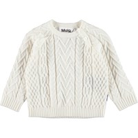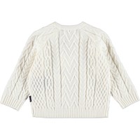Björk ist eine weiße Baby-Strickpullover mit Knöpfen im Kragen auf der Vorderseite. Dier Strickpullover enthält 80 % Baumwolle und 20 % Wolle.