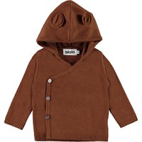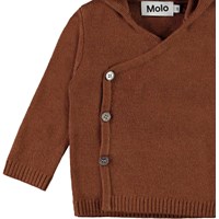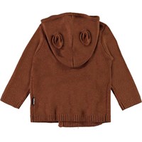 Bobby ist eine braune Strickjacke mit einem schrägen Knopfverschluss sowie einer Kapuze mit kleinen aufgenähten Ohren.