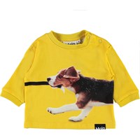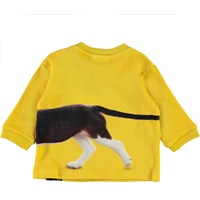 Dan ist ein gelbes Baby-Sweatshirt mit Druck eines Welpen auf der Vorder- und Rückseite des Pullovers. Ecocert Greenlife, certifikationsnr. 197496