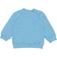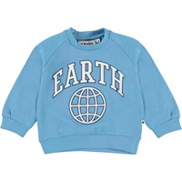 Disc ist ein blaues Baby-Sweatshirt mit dem Text „Earth“ und dem Aufdruck einer Weltkugel. Das Sweatshirt wird im Nacken geknöpft.