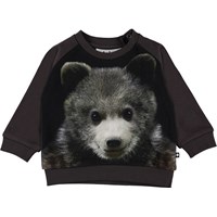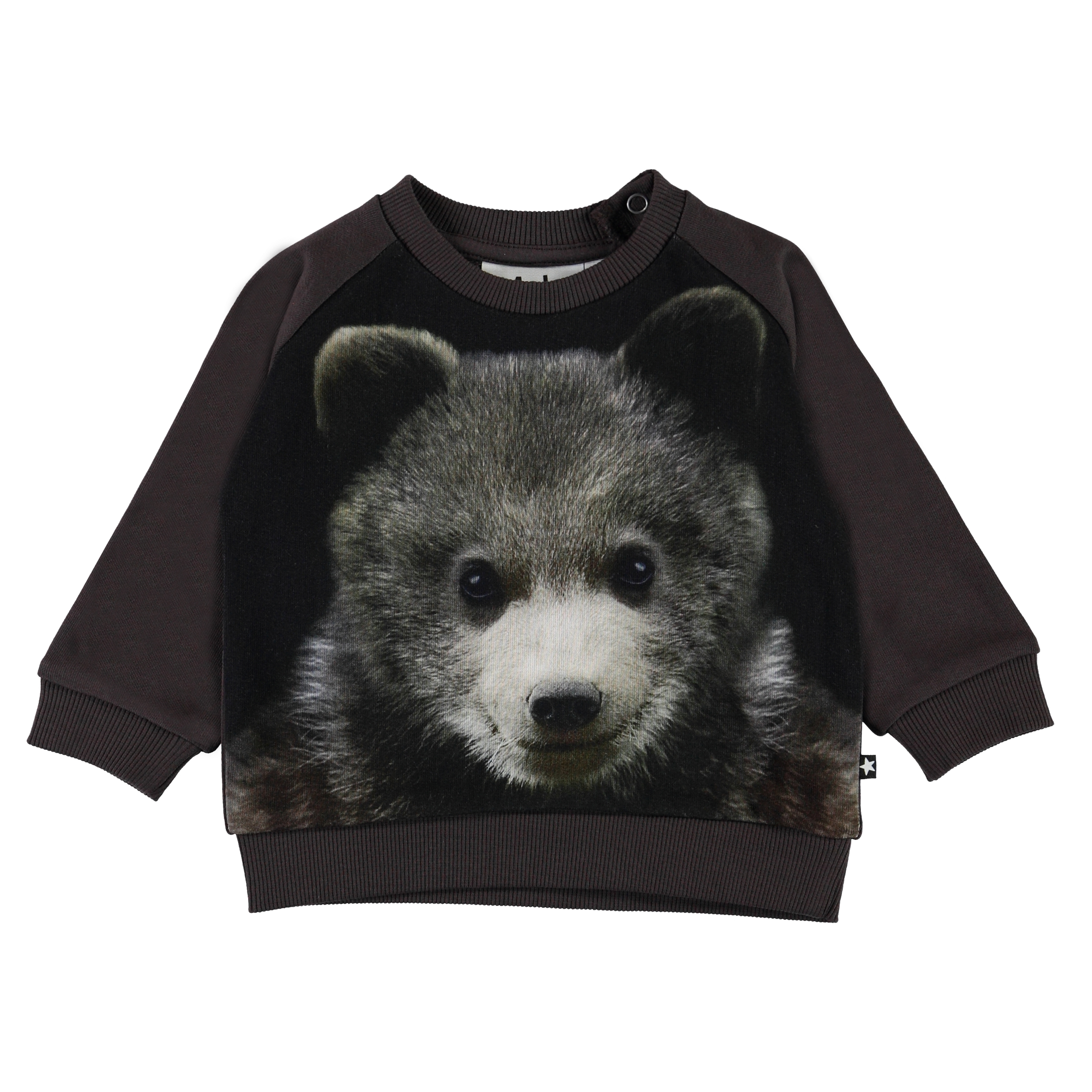 Disco ist eine braune Babybluse mit langen Ärmeln und Druck eines Aby-Bären auf der Vorderseite. Die Bluse hat einen Knopfverschluss im Nakken.