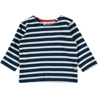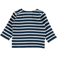 Dosti ist eine blau-weiß gestreifter Babypullover. Dosti hat einen Knopfverschluss auf der Rückseite einer Schulter, der das Ein- und Aussteigen erleichtert.