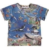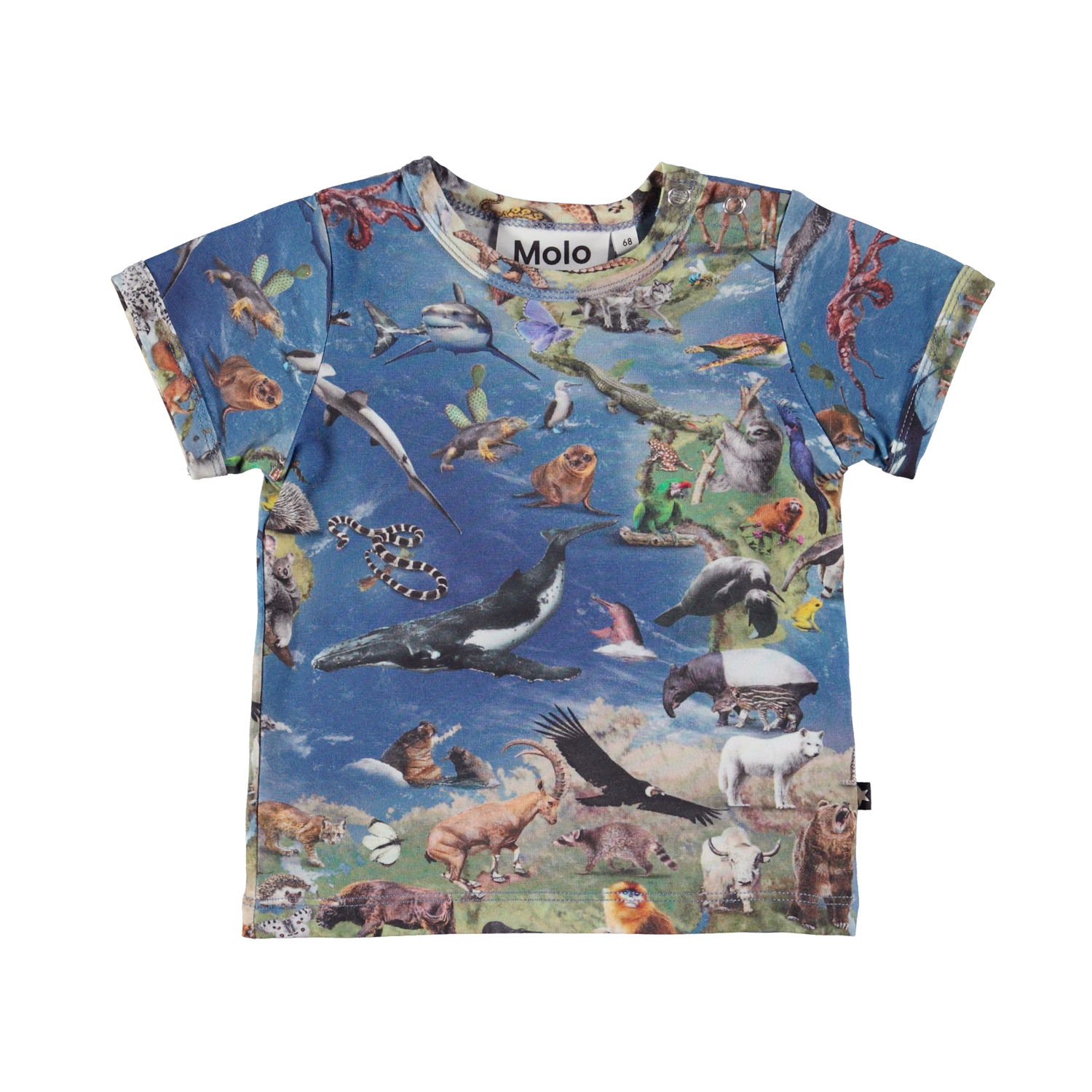 Easy ist ein blaues Baby-T-Shirt aus 100 % Öko-Baumwolljersey. Das T-Shirt hat einen Allover-Print, Animal Earth, der die Kontinente unseres Planeten und alle Tiere zeigt, die sowohl im Wasser als auch an Land leben.