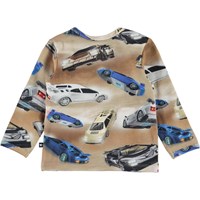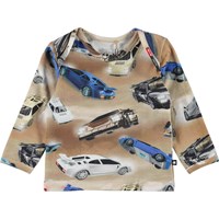 Elan ist ein langärmliges Baby-T-Shirt aus Öko-Baumwolle mit einem lustigen Auto-Print auf hellbraunem Hintergrund.