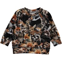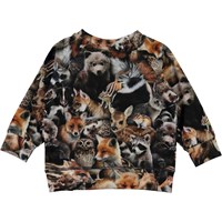Elmo ist ein Babypullover mit Drucken der verschiedenen Tiere des Waldes. Elmo hat Raglanärmel und einen runden Halsausschnitt.