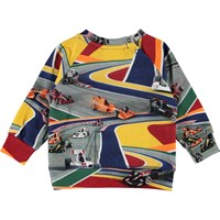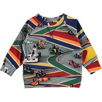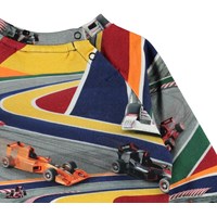Elmo ist eine Babybluse mit Druck von bunten Rennautos. Elmo hat Raglanärmel und einen runden Halsausschnitt.