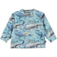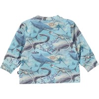 Eloy ist eine blaue Babyshirt aus 100 % Öko-Baumwolljersey. Das Shirt hat lange Ärmel und einen Knopfverschluss an einer Schulter, was das An- und Ausziehen erleichtert. Eloy ist im Allover-Print Ancient Ocean zu sehen, auf dem Sie sowohl Haie und Tintenfische als auch prähistorische Meeresdinosaurier sehen.