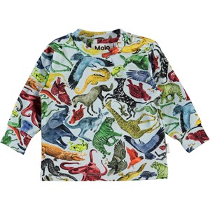 Eloy ist ein hellblauer Baby-Pullover mit Druck von bunten Tieren. Eloy hat einen Knopfverschluss auf der einen Schulter, der es einfach macht, den Pullover an und ab zu bekommen. Ecocert Greenlife, certifikationsnr. 197496