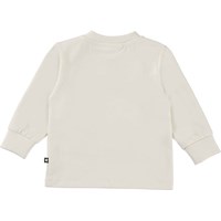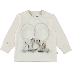 Eloy ist eine cremefarbene Babybluse mit einem niedlichen kleinen Affen-Print, dessen Schwänze ein Herz bilden. Eloy hat an einer Schulter einen Knopfverschluss, der das An- und Ausziehen erleichtert.