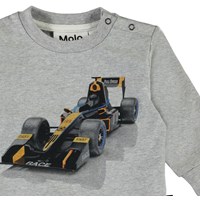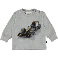 Eloy ist eine graue Babybluse mit dem Druck eines Rennautos. Eloy hat einen Knopfverschluss an einer Schulter und blaue Ärmel und Rücken.