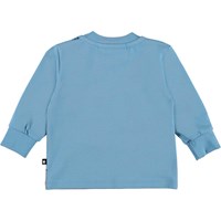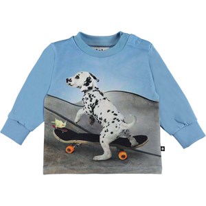 Eloy ist eine hellblaue Babybluse mit dem Aufdruck eines süßen Welpen und Nymphensittichs, die zusammen skaten. Eloy hat an einer Schulter einen Knopfverschluss, der das An- und Ausziehen erleichtert.