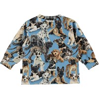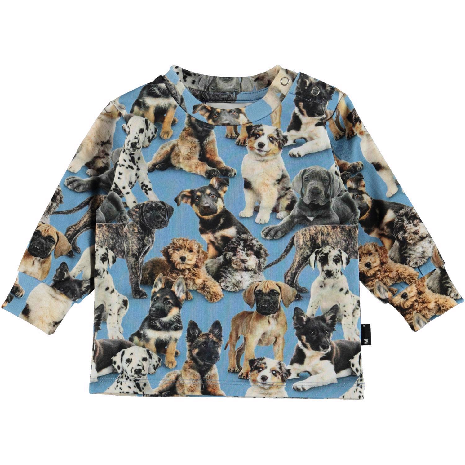 Eloy ist eine hellblaue Öko-Babybluse mit süßem Welpen-Print. Eloy hat an einer Schulter einen Knopfverschluss, der das An- und Ausziehen erleichtert.
