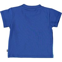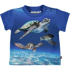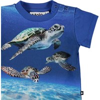 Emilio ist ein Baby-T-Shirt in Blau mit Druck von Schildkröten auf der Vorderseite. Der T-Shirt hat einen Knopfverschluss auf der einen Schulter. Ecocert Greenlife, certifikationsnr. 197496