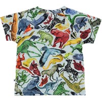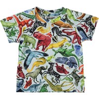 Emmett ist ein Baumwoll-Baby-T-Shirt  in Hellblau mit Druck von bunten wilden Tieren. Emmett hat einen Knopf im Nacken, der es leicht macht, das T-Shirt ab und an zu bekommen.  Ecocert Greenlife, certifikationsnr. 197496