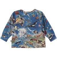 Enez ist eine blaue Babyshirt aus 100 % Öko-Baumwolljersey. Das Shirt hat lange Ärmel und einen Knopfverschluss an jeder Schulter, was das An- und Ausziehen erleichtert. Eloy hat einen Allover-Print, Animal Earth, der die Kontinente unseres Planeten und alle Tiere zeigt, die sowohl im Wasser als auch an Land leben.