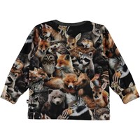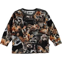 Enez ist ein Babypullover mit Drucken der verschiedenen Tiere des Waldes. Eloy hat an jeder Schulter einen Knopfverschluss, der das Ein- und Aussteigen erleichtert.