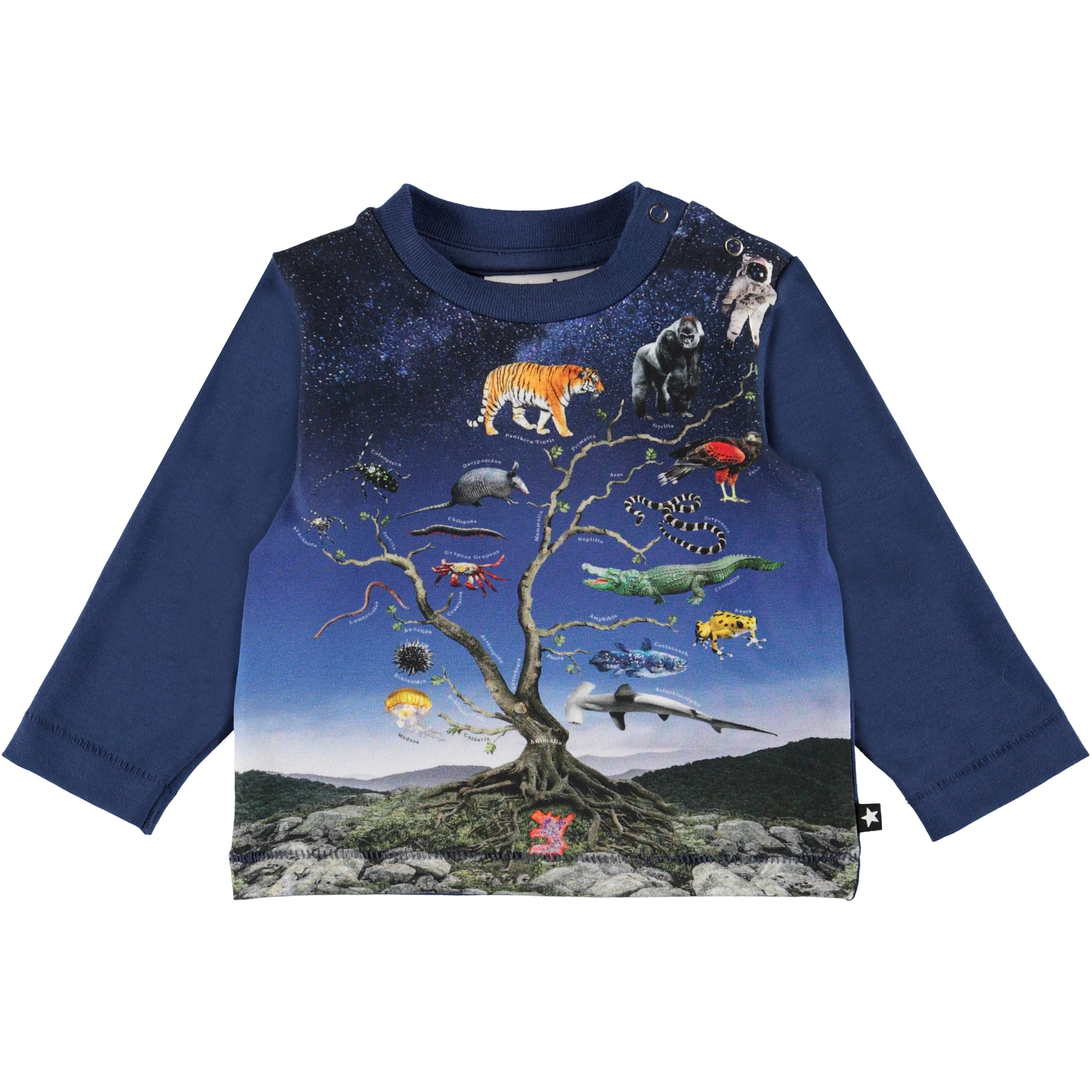 Entdecke den Aufdruck "Tree of Life" hier auf der blauen Babybluse Enovan. Die Bluse hat einen Knopfverschluss an einer Schulter, der das An- und Ausziehen der Bluse erleichtert.