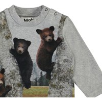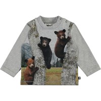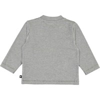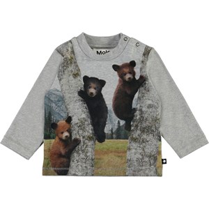 Enovan ist eine graue Babybluse mit Bärendruck. Enovan hat einen Knopfverschluss an einer Schulter und dunkelblaue Ärmel und Rücken.