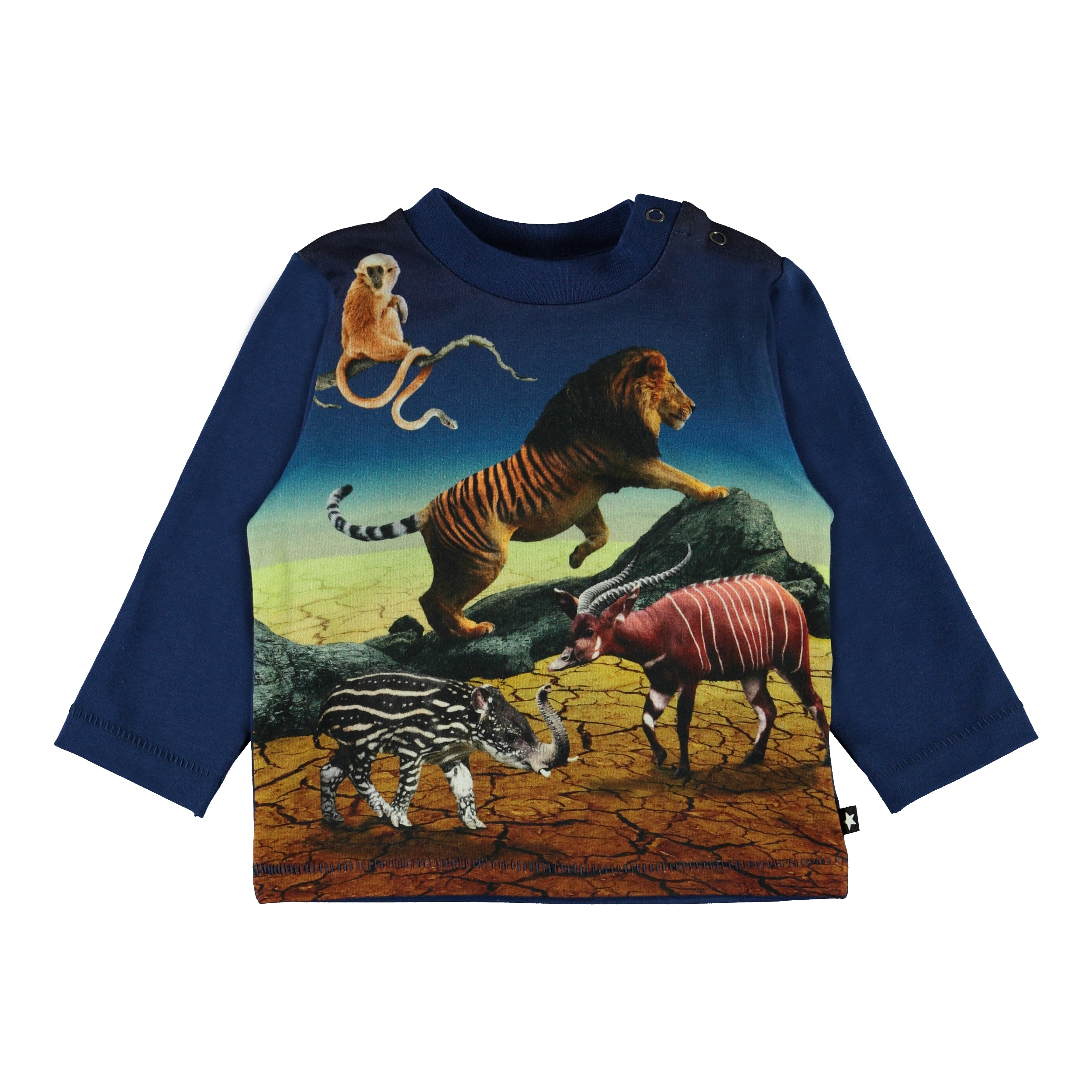 Enovan ist eine blaue Babybluse mit dem Druck "Wild Future" auf der Vorderseite, mit wilden Tieren aus der Zukunft. Kannst du sehen, welche Tiere ihre Vorfahren sind? Enovan hat einen Knopfverschluss an einer Schulter und dunkelblaue Ärmel und Rücken.